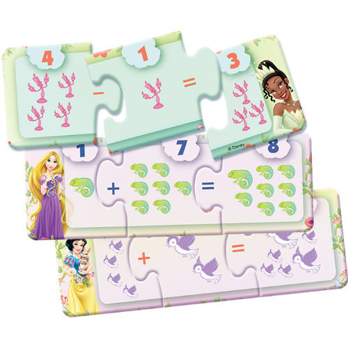 Прибавляйте или вычитайте числа, складывая ряд из красочных элементов с изображениями Белоснежки, Золушки, Тианы, Авроры и Ариэли.