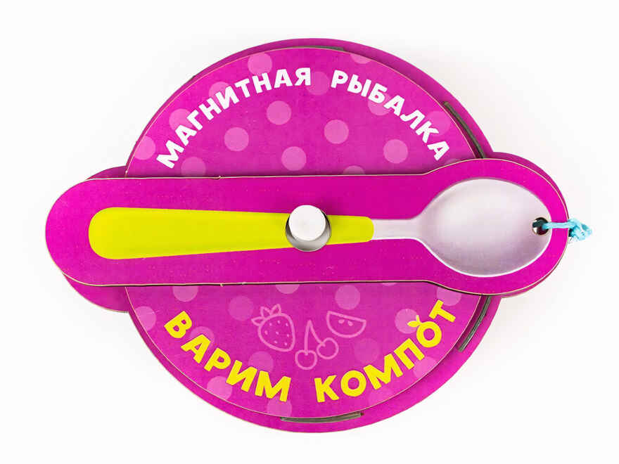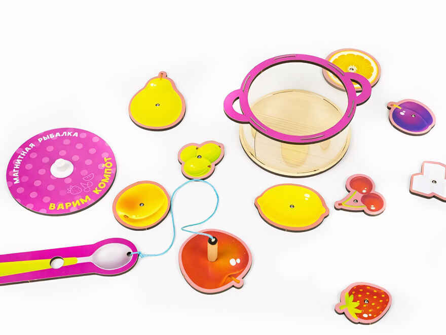 Игра с магнитами представляет собой фанерную кастрюльку и 10 вкладышей-ингридиентов. А так же магнитная удочка-ложка.