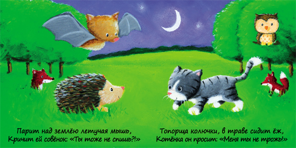 В этой книге малышу посчастливится побывать на ночной прогулке вместе с любопытным совенком и повстречать лису с лисятами, ежа, котенка и летучаю мышь.