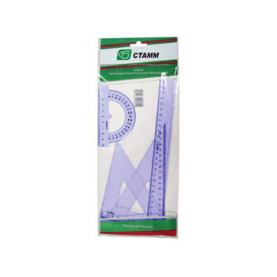 В набор входят: линейка 30 см, транспортир – 10/180, 2 треугольника – 12/45 и 18/30.