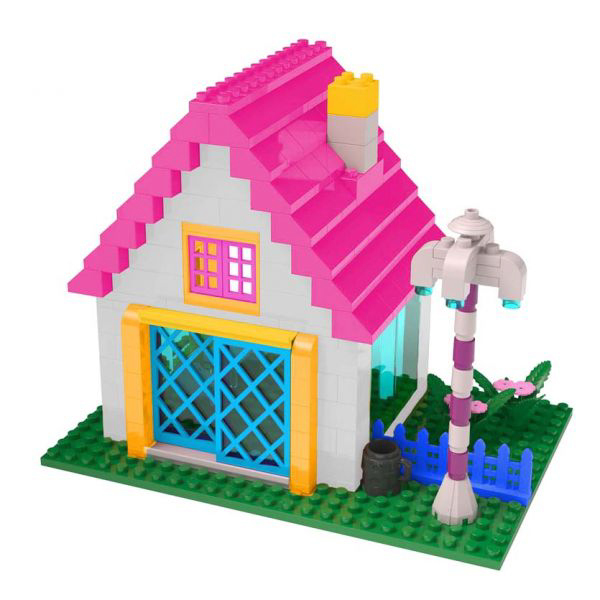 Из деталей конструктора от известной российской компании "Город мастеров" девочка соберет уютный домик с розовой крышей и яркой зеленой лужайкой во дворе.