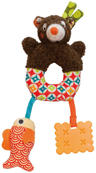 У мишутки бубенчик в голове, а также всегда при себе рыбка-пищалка и вкусная печенька-прорезыватель, чтобы малыш мог почесать растущие зубки!