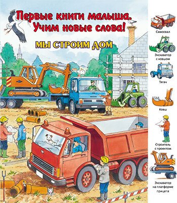 28 декабря 2016Книга состоит из пяти разворотов на плотной бумаге,на которых изображены этапы строительства дома.Моему малышу 1,5 лет очень нравится рассматривать строительные машины на картинках и искать те же в уменьшенном варианте по бокам.Текст мы пока еще не читаем,но рассматриваем с удовольствием.Картинки прорисованы качественно и красиво.